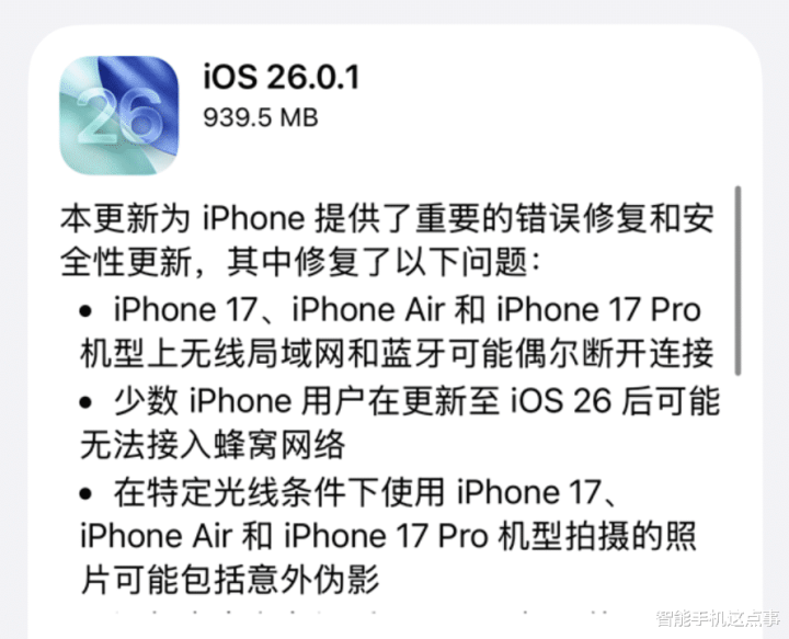 iOS 26.0.1修复了在特定光线条件下使用iPhone17、iPhone Air和iPhone17 Pro机型拍摄照片时可能出现的意外伪影。